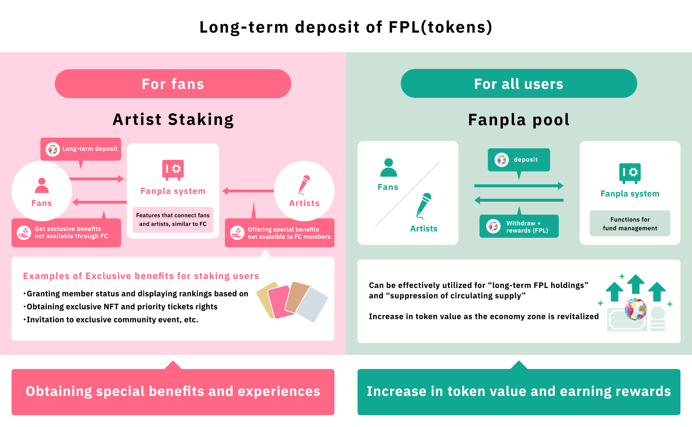 There are two types of staking: "Artist Staking" and "Fanpla Pool," each with different characteristics.